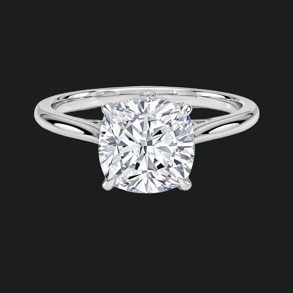 • Centre Stone: The centerpiece is a precisely faceted cushion-cut stone of exceptional D-F color and VS1-VS2 clarity, celebrated for its soft silhouette and deep, captivating fire. The carat weight is fully customizable to your preference.