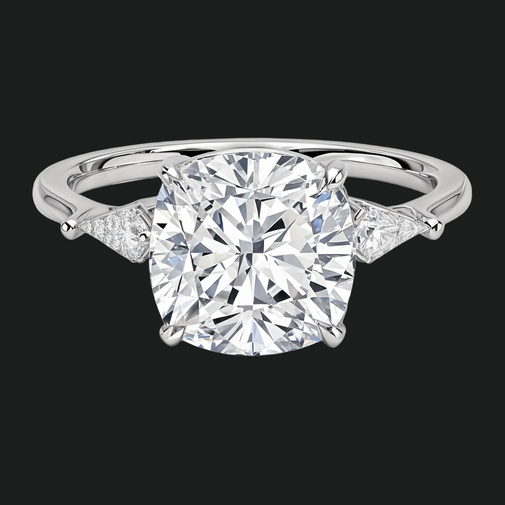 Cushion Cut Three Stone Engagement Ring with Kite Diamond Accents