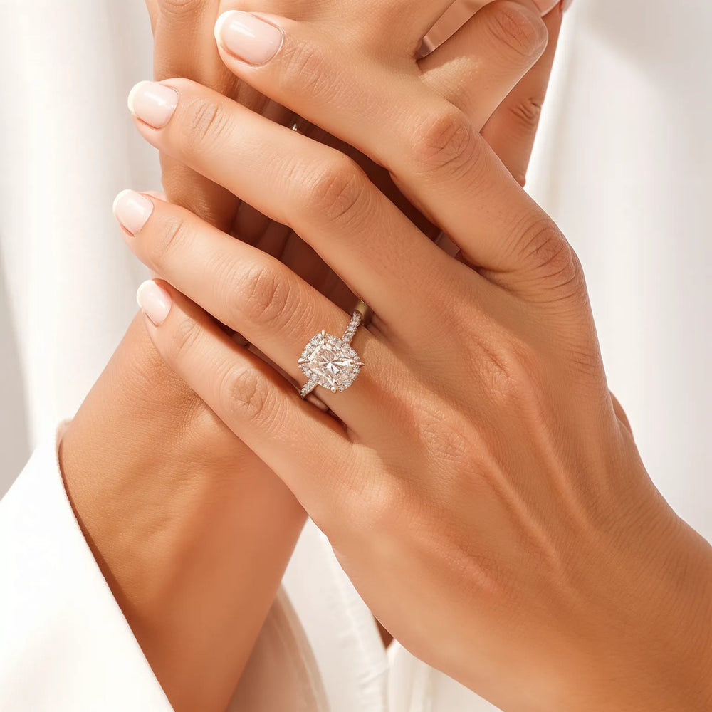 • Setting & Band: The center stone is held in a secure four-claw setting, allowing for maximum light entry. It is encircled by a luminous halo of 22 round diamond accents, all set within a pavé band of 14 stones. The entire structure is crafted from your choice of precious metal, with a band width of approximately 1.8mm.