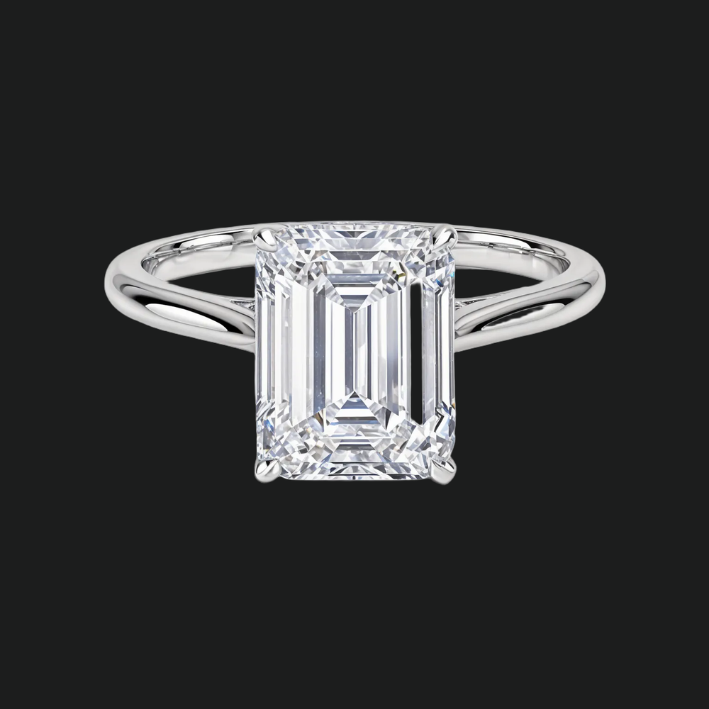 • Centre Stone: The centerpiece is a precisely faceted emerald-cut stone of exceptional D color and VVS1 clarity, renowned for its clean, hall-of-mirrors effect and elegant, step-cut brilliance. The carat weight is fully customizable to your preference.