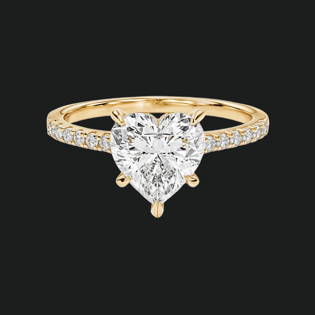 A symbol of devotion, shaped by light. This cathedral-style engagement ring features a brilliant heart-cut center stone—a shape universally known to represent deep, lasting love. Elevated by graceful arches, the stone appears to float, radiating warmth and brilliance from every angle, while the band is traced with pavé-set diamond accents for a soft trail of sparkle.