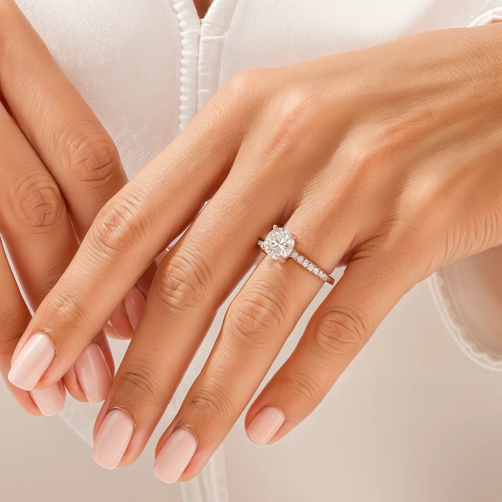 • Setting & Band: The stone is elevated on a cathedral setting with pavé accents, its graceful arches designed to flood the piece with light. The slender band is meticulously set with round diamond accents in a micro prong setting, enhancing the ring's overall radiance.