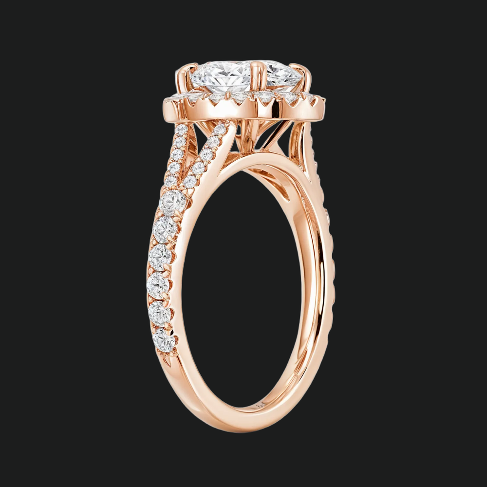 This ring masterfully unites timeless elegance with a distinctly modern structure. The brilliant oval cut center stone is enhanced by a delicate halo, creating a captivating play of light and dimension. The split-shank band provides a contemporary foundation, ensuring a feeling of balance and lightness on the hand.
