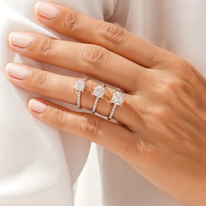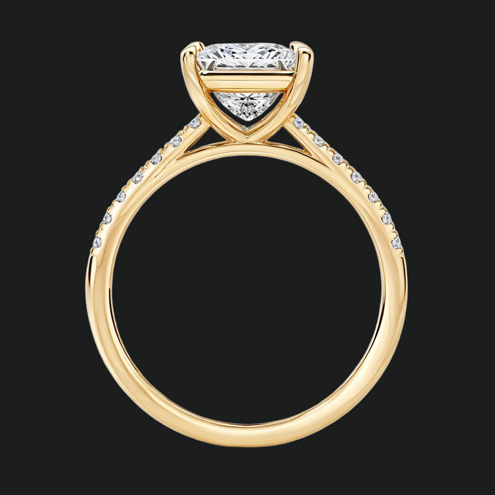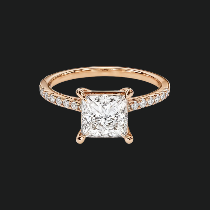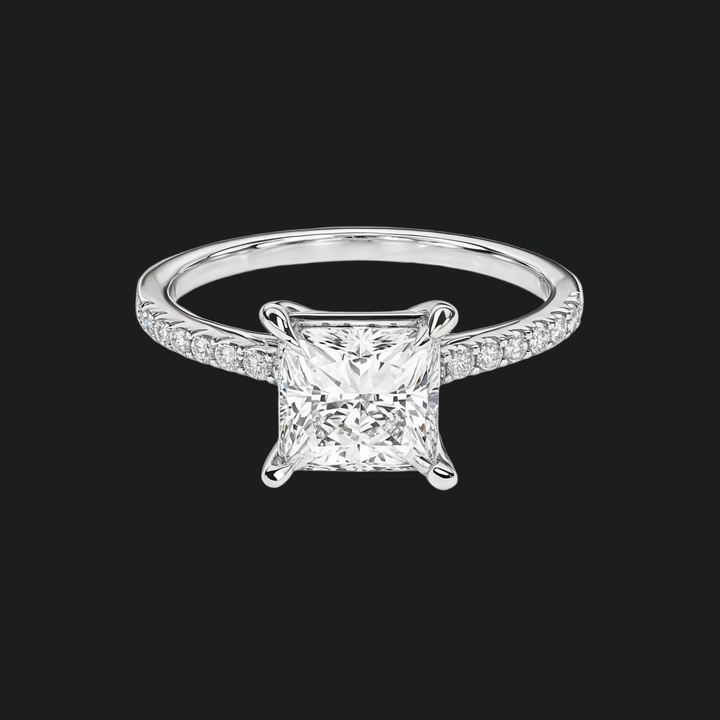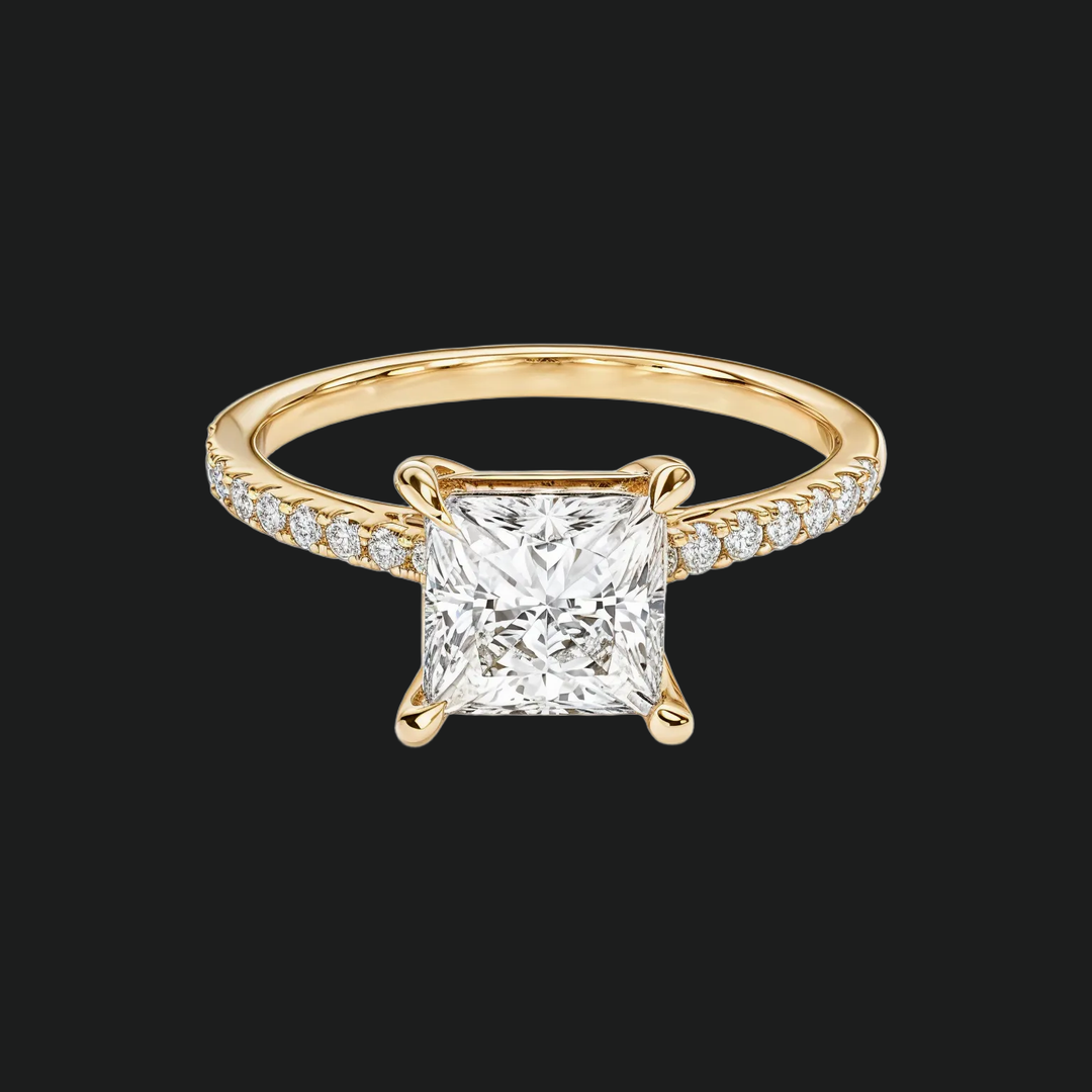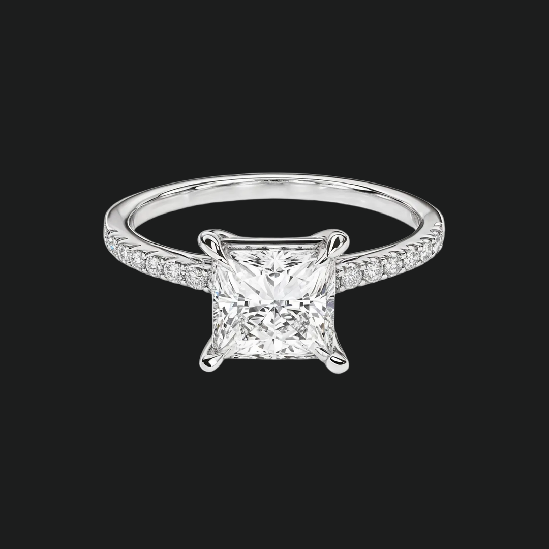 • Centre Stone: A sharp-edged princess cut diamond with exceptional clarity and colorless grade, rising like a crown with geometric brilliance. Available in a range of carat weights, fully customizable to your preference.