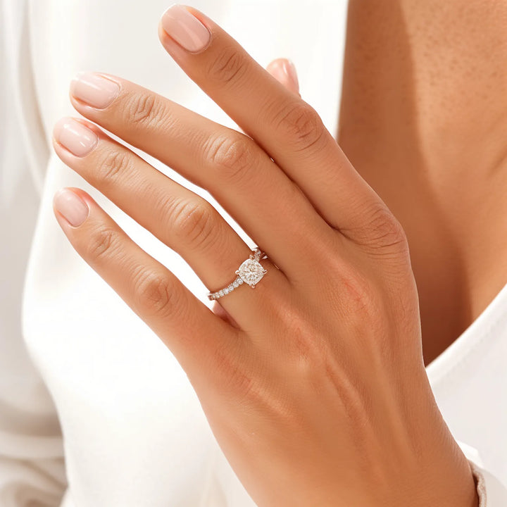 • Setting & Band: The stone is held in a secure four-prong setting, elevated by sculptural cathedral shoulders. The slender band is meticulously set with a continuous row of round diamond accents in a micro prong setting.
