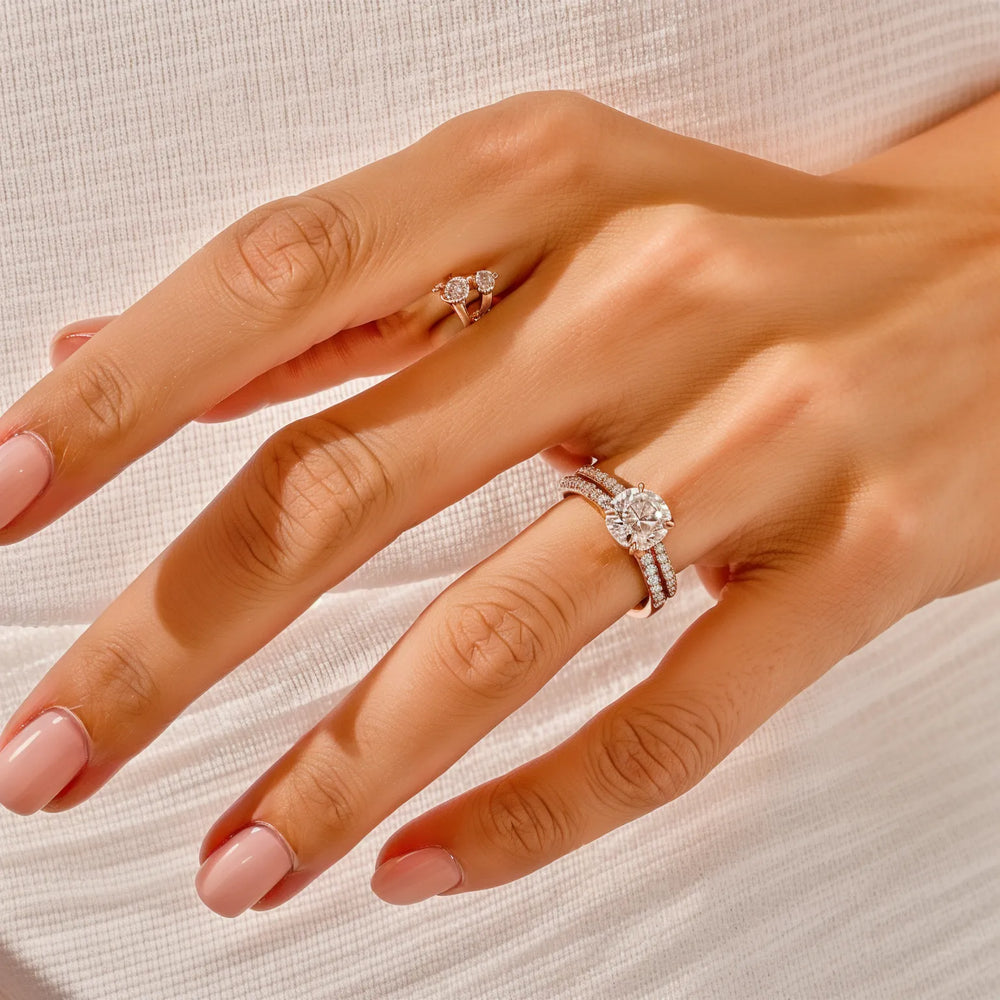 • Setting & Band: The center stone is secured by a four-prong setting, flanked by fourteen pavé-set diamond accents. Both rings feature a slender, contemporary profile with a pavé band design, where small diamonds are set closely together along the shank.