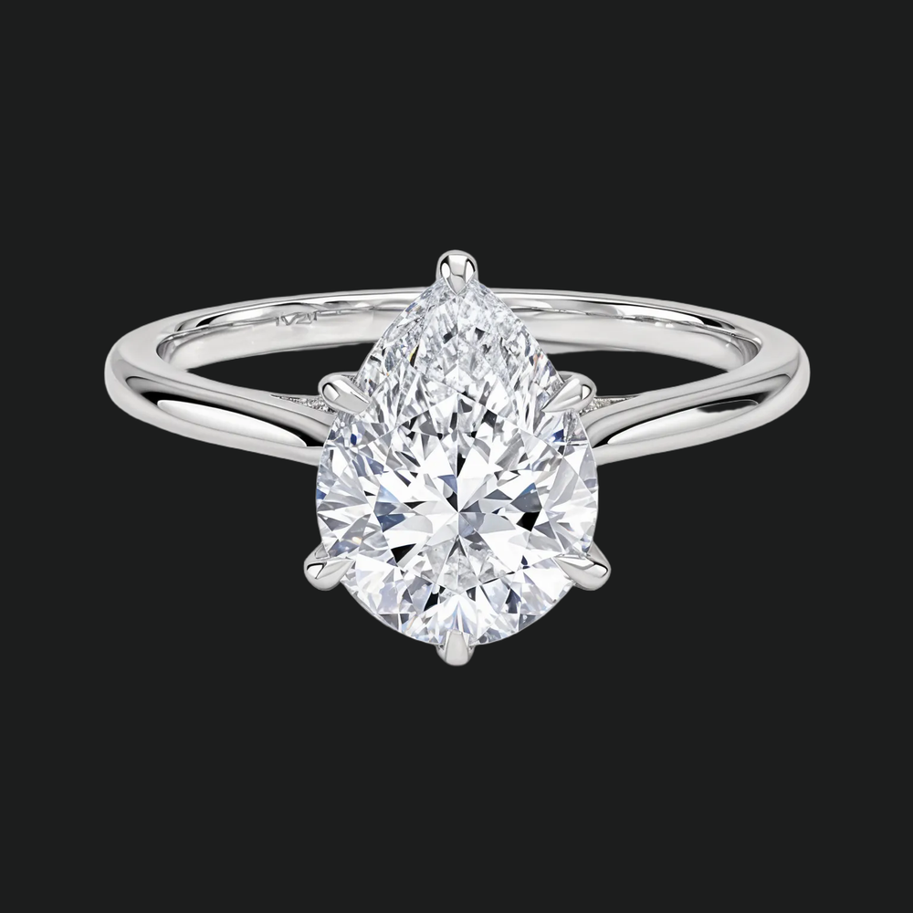 A study in sophisticated proportion, this ring elongates the finger with its graceful pear silhouette. The hidden halo and pavé bridge create a captivating diffusion of light, ensuring a soft, all-encompassing sparkle that never overwhelms the design's refined architecture.