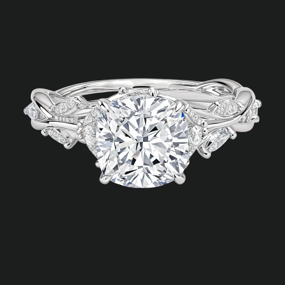 • Postavljanje i pojas: Kamen je osiguran rafiniranom postavkom kandži koja maksimizira njegovo izlaganje svjetlu. Poveznik nadahnut prirodom, širok otprilike 4,00 mm, sadrži šesnaest dijamantskih naglasnica markize, postavljeno za oponašanje osjetljivih vinova loza. Izrađen u vašem izboru čvrstog zlata ili platine s visokim poljskim završetkom.